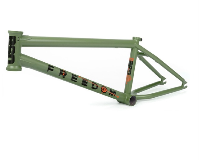 BSD FREEDOM Frame 20.2” Military Green Kriss Kyleは、ボウル、ストリート、ダート、何でも乗りこなすタイプのライダー。彼のシグネチャーであるFreedomフレームは、あらゆる地形で乗れるように設計されており、重心を低い位置で確保できる11.5インチのBBハイト、反応性を高める75°のヘッドアングル、クイックな動きを助ける短いリアエンドと多用途性を兼ね備えています。より強いリアトライアングルを作るために、インベストキャスト製ウィッシュボーンとインベストキャスト製シートステイブリッジを採用し、横向きでの着地などでも安定感を発揮します。 Kriss Kyle is the type of rider who likes to ride everything, bowls, street, dirt, the lot. His signature Freedom frame is designed to perform well on all terrain, this frame combines the stability of a low 11.5" BB, the responsiveness of a 75° headangle and the versatility of a short rear end. To create a stiffer rear triangle we've utilized an invest cast wishbone and invest cast seatstay bridge, great for sideways landings!! 素材 Tubing: Sanko Japanese seamless 4130 chromoly スペック Top tube lengths: 20.2 Headtube angle: 75° Headtube length: 117mm Seattube angle: 69.5° Rear end length: 13.2″ – 13.625″ BB Height: 11.5" Standover height: 9" Weight: 2260g Brake mounts: removable ブレーキマウント別売り☆ジャイロ取り付けもOK